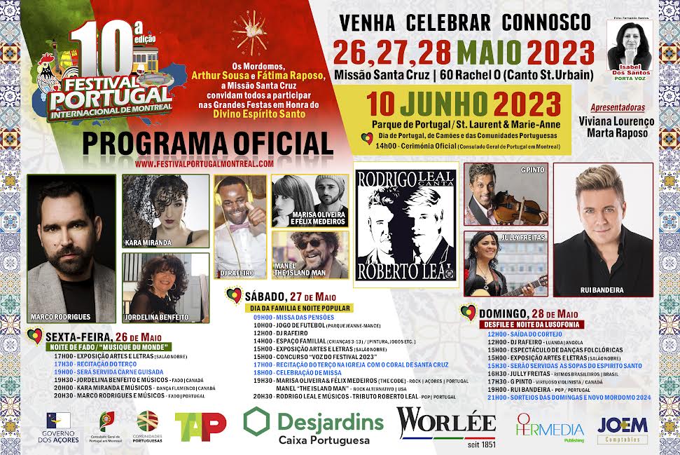 The Festival Portugal International de Montreal, together with Fátima Raposo and Arthur Sousa, stewards of the Divine Holy Spirit of Santa Cruz, present the 10th Edition of the Festival Portugal International de Montreal, which will take place on May 26, 27 and 28.