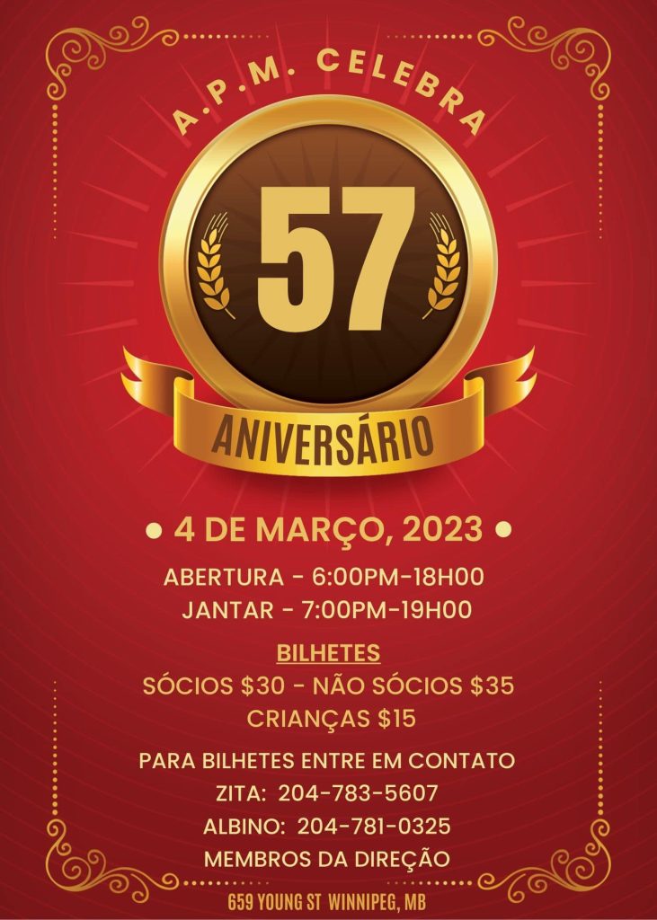 The Portuguese Association of Manitoba celebrates its 57th anniversary on March 4 (Saturday), beginning at 6 pm, at the Portuguese Association of Manitoba (659 Young Street, Winnipeg, MB, Canada, Manitoba).