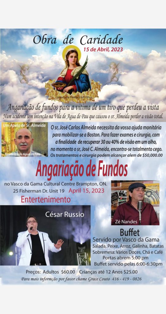 On April 15th (Saturday), at 5pm, there will be a fundraiser for Mr. José Carlos Almeida, victim of a gunshot wound that caused him to lose his sight, at the Vasco da Gama Cultural Centre Brampton (25 Fisherman Dr. Unit 19, Ontario, Canada)