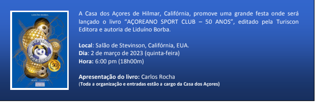 The Casa dos Açores in Hilmar will promote on March 2 (Thursday), at 6pm, a launch party for the book “Açoreano Sport Club – 50 Years”, published by Turiscon Editora and authored by Liduíno Borba, at the Stenvinson Hall (California, United States of America).