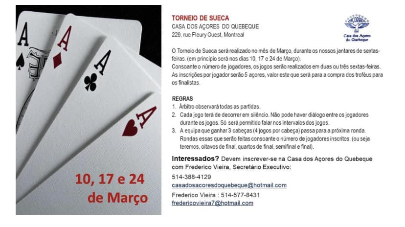 Those interested in participating in the Sueca Tournaments, will have to register at the Casa dos Açores do Quebec, through email or phone contact with the Casa dos Açores do Quebec or Frederico Vieira, Executive Secretary, respectively: